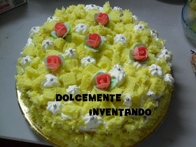 Dopo aver bagnato solo 3 dischi di pan di spagna, farcite con la panna fino a ricoprire la torta con un leggero strato. Tagliate a dadini il quarto disco di pan di spagna e applicate i quadratini di mimosa sopra la torta e lungo i lati. Infine decorate con delle roselline o delle foglioline di zucchero!!!!
