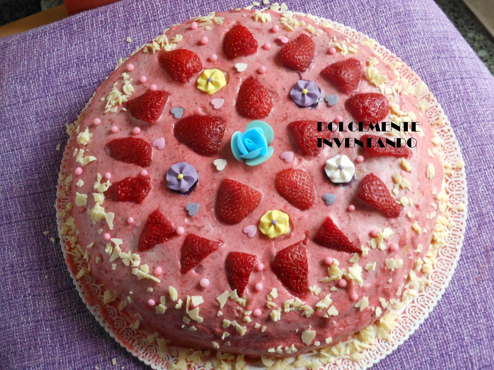 Farcite il pan di spagna con la mousse, ricoprite con il secondo disco e stendete la mousse avanzata a mo’ di glassa, decorate con le fragole, fiorellini e cuoricini.
