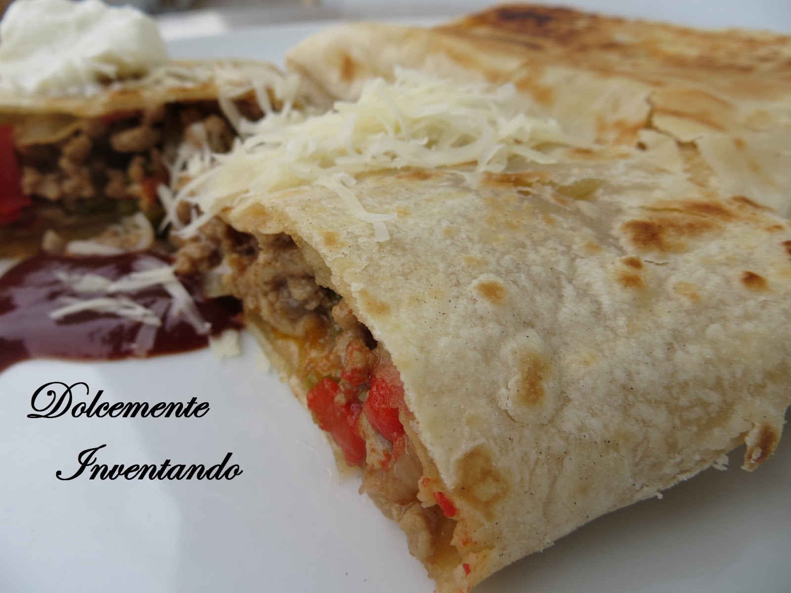 Prendete qualche cucchiaio di carne e peperoni  e ponetela al centro di ogni tortilla, chiudete la tortilla a mo’ di busta, piegando verso il centro prima le estremità inferiore e superiore,  in seguito piegate anche i lati.