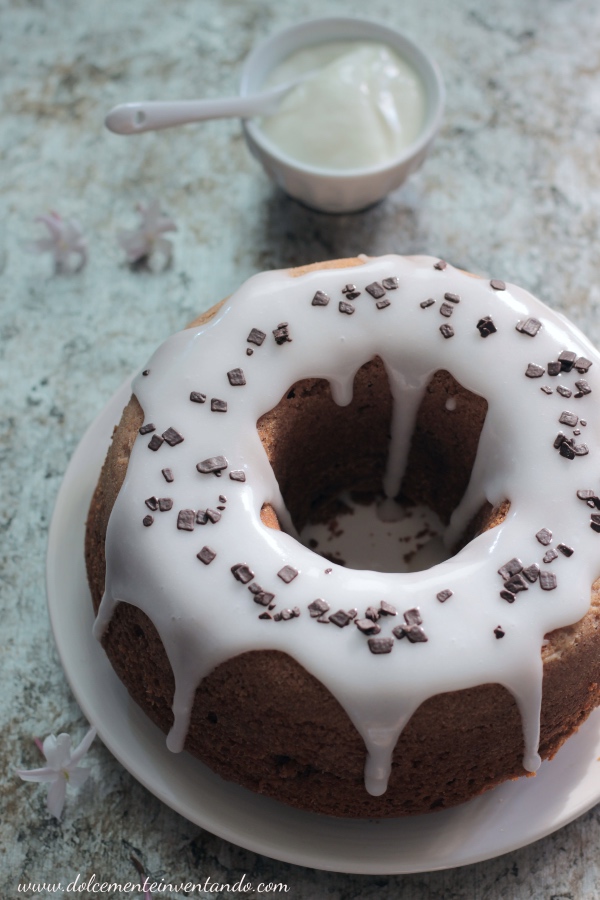 Estraete la ciambella una volta fredda e decorate con la glassa e scagliette di cacao.
