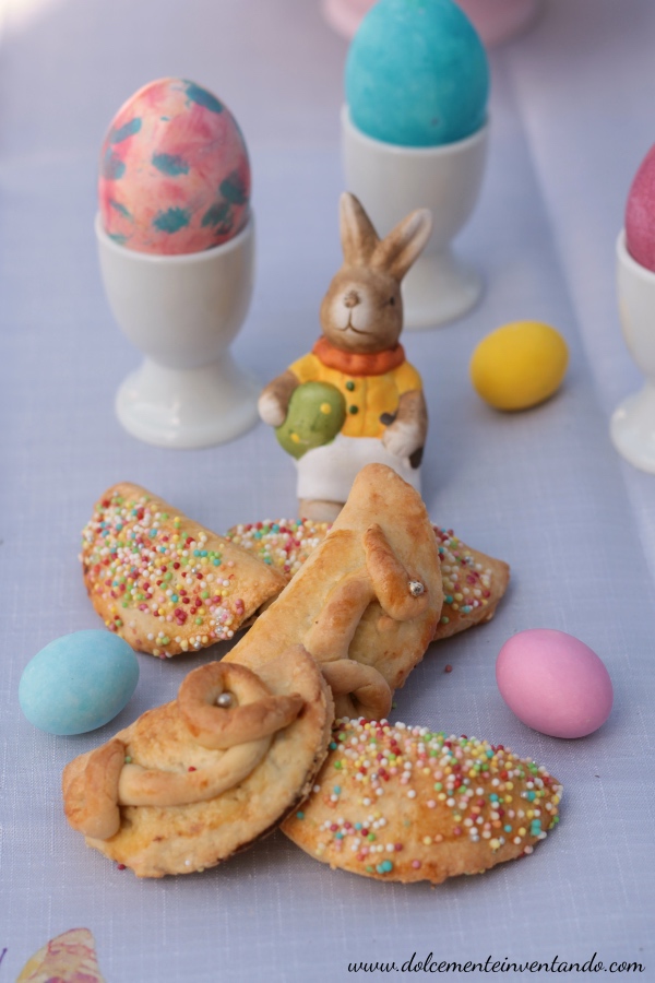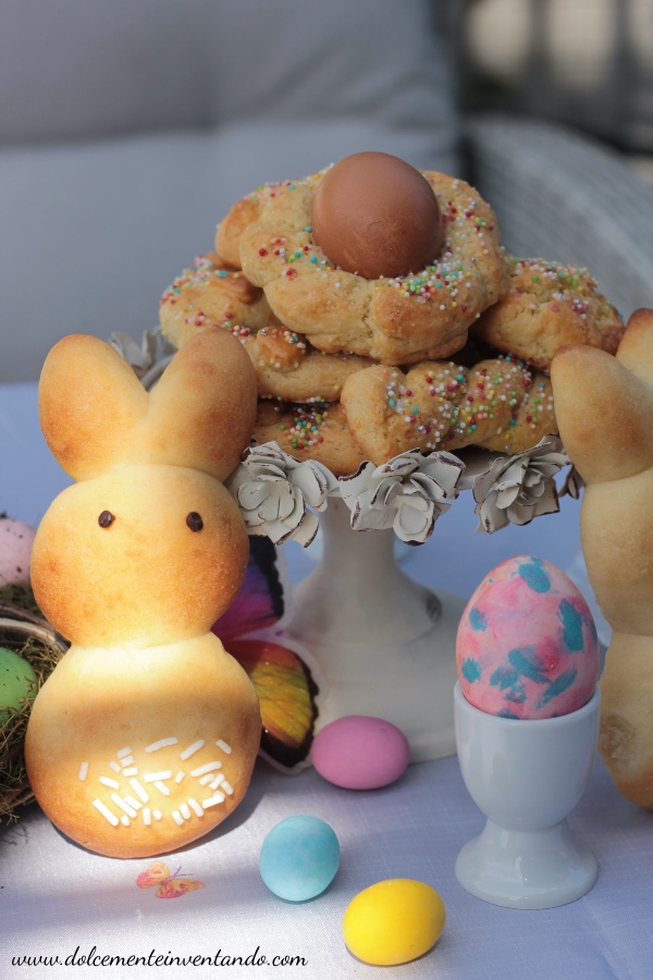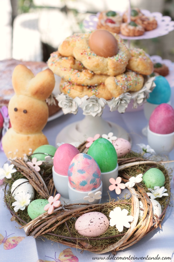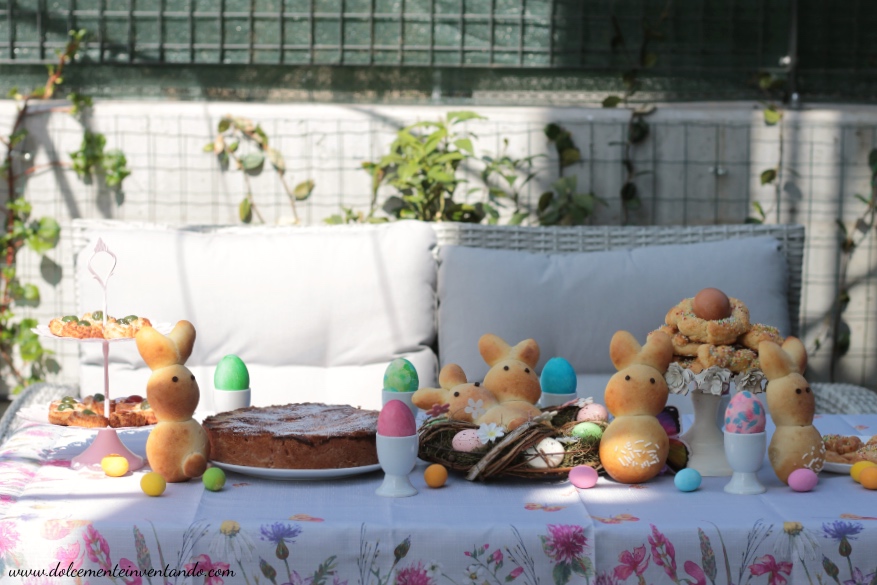 Per l’occasione ho preparato una tavola imbandita di dolci per la nostra colazione di Pasqua: cuzzupe, nepitelle, pastiera, paste di mandorla, uova colorate e tanti coniglietti.