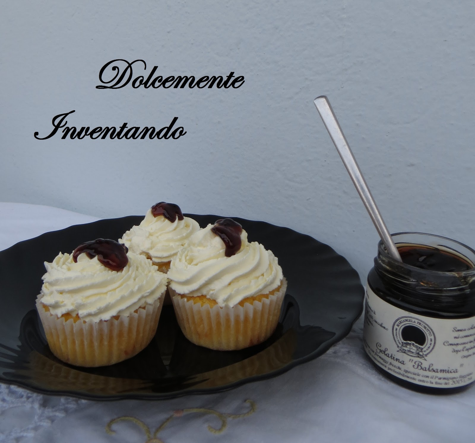Quando le cupcakes saranno cotte e raffreddate, decorate le tortine con la tasca e mettete un po’ di gelatina di balsamico in superficie.