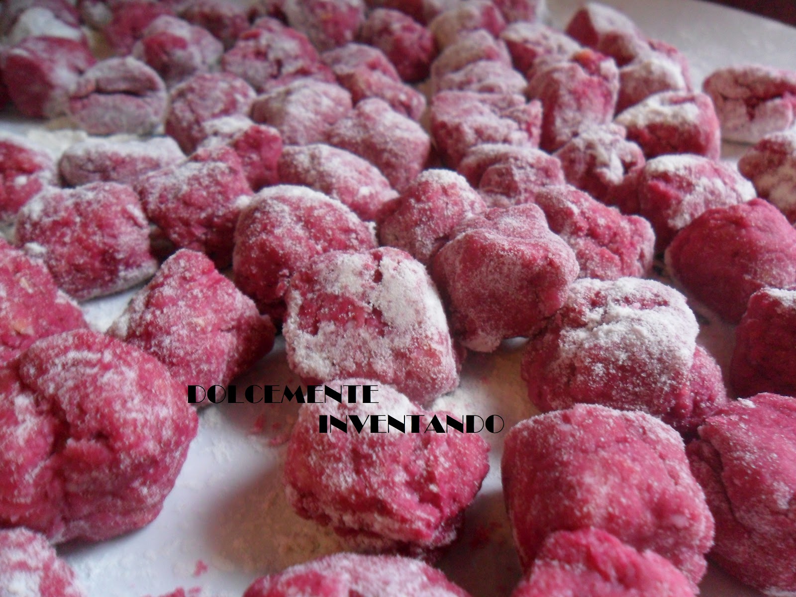 Formate degli gnocchetti con le mani oppure facendo dei serpentelli di pasta, tagliate a tocchetti con un coltello. Hanno un colore fantastico, sono di un fucsia vivo, vedete???