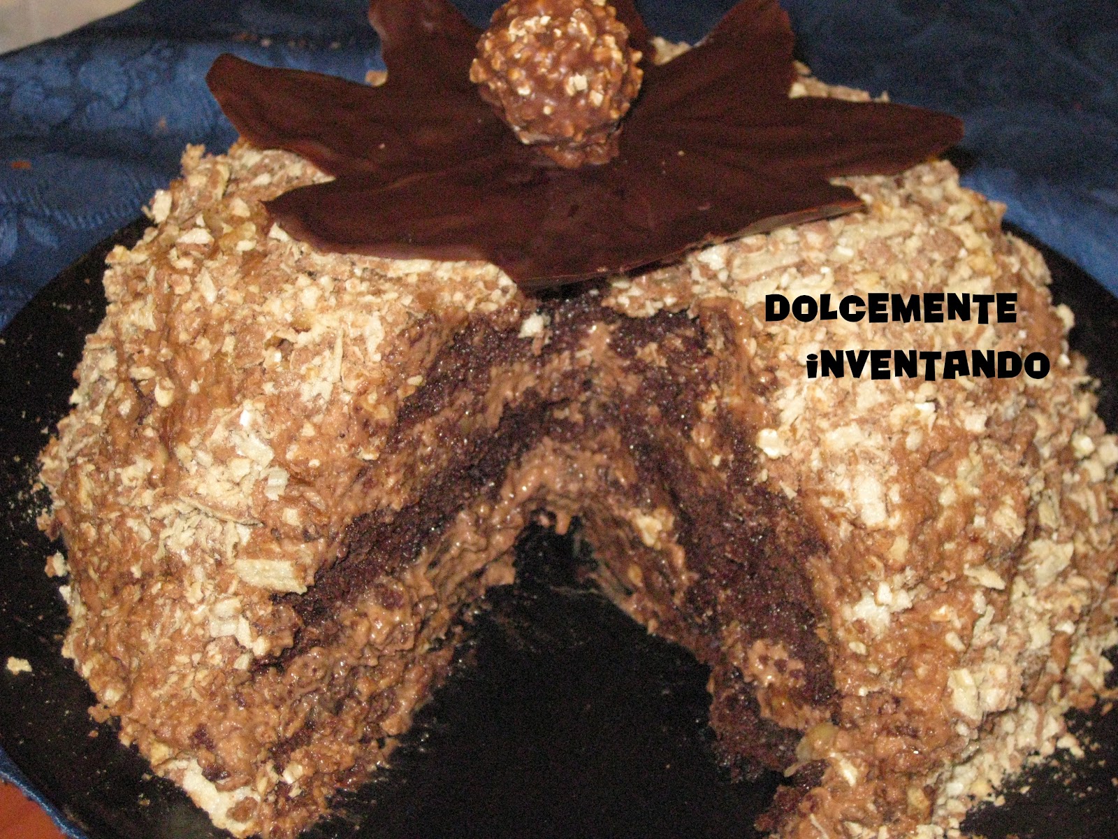 Io ho pensato di decorare la torta con un fiore di cioccolato fondente fatto da me e un ferrero rocher al centro e per collante ho usato una punta di Nutella… che ve ne pare????