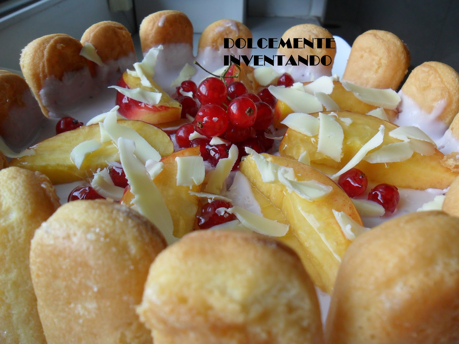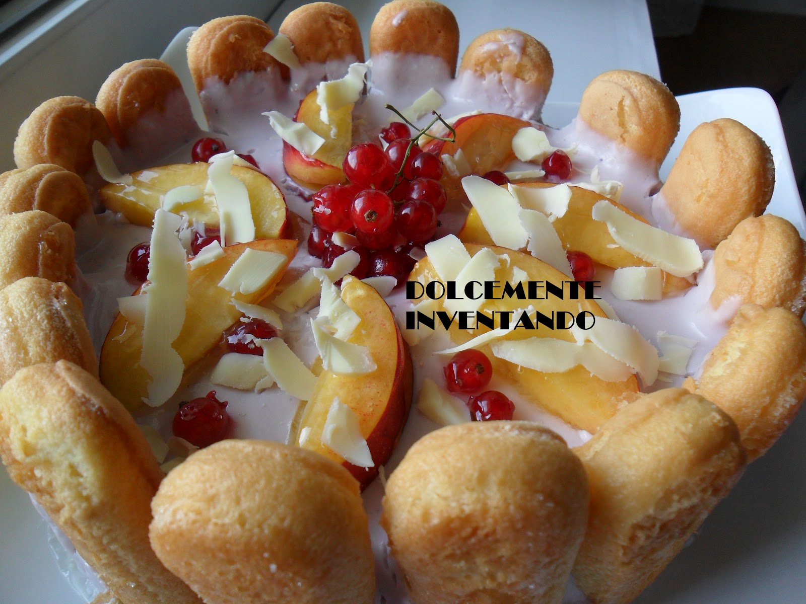 CHARLOTTE AL MIRTILLO E CIOCCOLATO BIANCO CON PESCHE E RIBES ROSSO