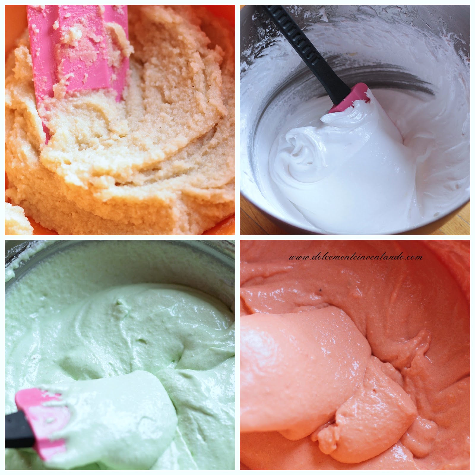 L’altra parte della meringa l’ho colorata di arancione (mescolando in parti uguali rosso e giallo) e unito delicatamente l’impasto di mandorle aromatizzato all’arancia.