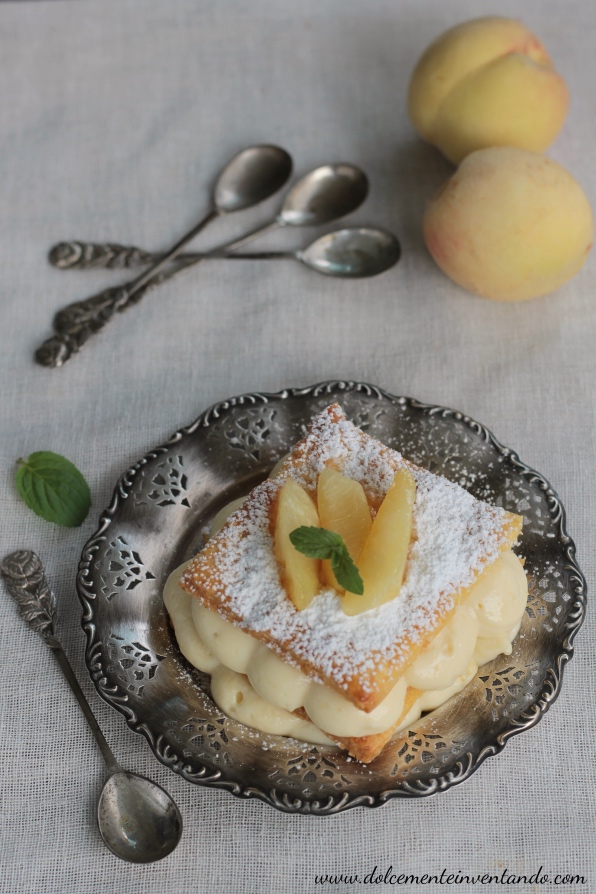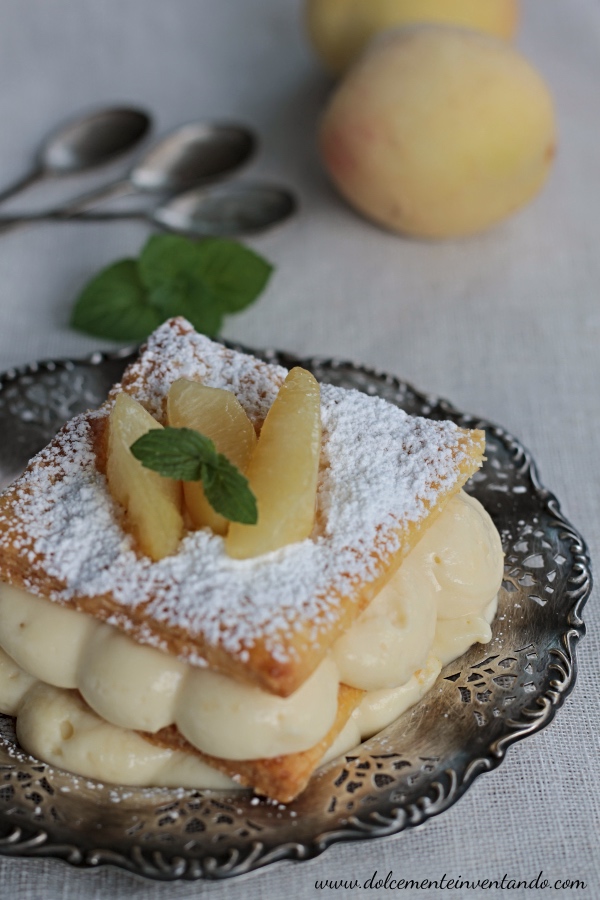 Il millefoglie alle pesche di Magisano caramellate è un dolce godurioso al massimo, avvolgente, cremoso e profumato.