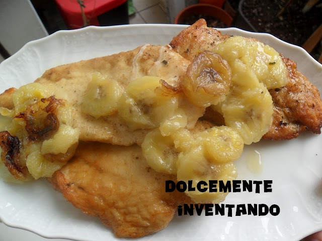 Tagliate la banana a fettine e fatele dorare in padella con un po’ di olio (preferite una padella antiaderente). Appena dorate, toglietele dalla padella e nella stessa mettete il petto di pollo infarinato e rosolatelo bene. Alla cottura aggiungete succo di limone e, se ne avete, anche mezzo bicchierino di vino bianco (di cui io non disponevo). infine aromatizzate con le spezie, sale, pepe.