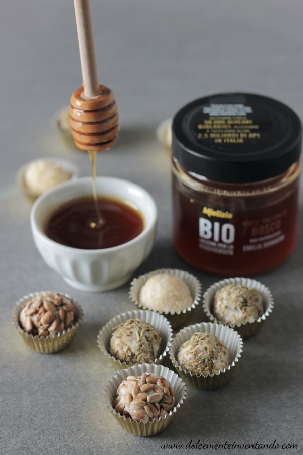 Morbida ricotta fresca, parmigiano e miele di bosco creano dei tartufi salati davvero gustosi e stuzzicanti, provateli anche voi.