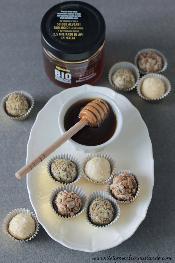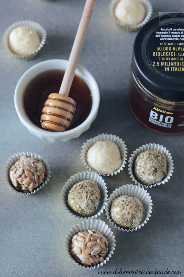 Le praline al formaggio e miele di bosco sono dei perfetti finger food ideali per buffet, da preparare anche con largo anticipo.