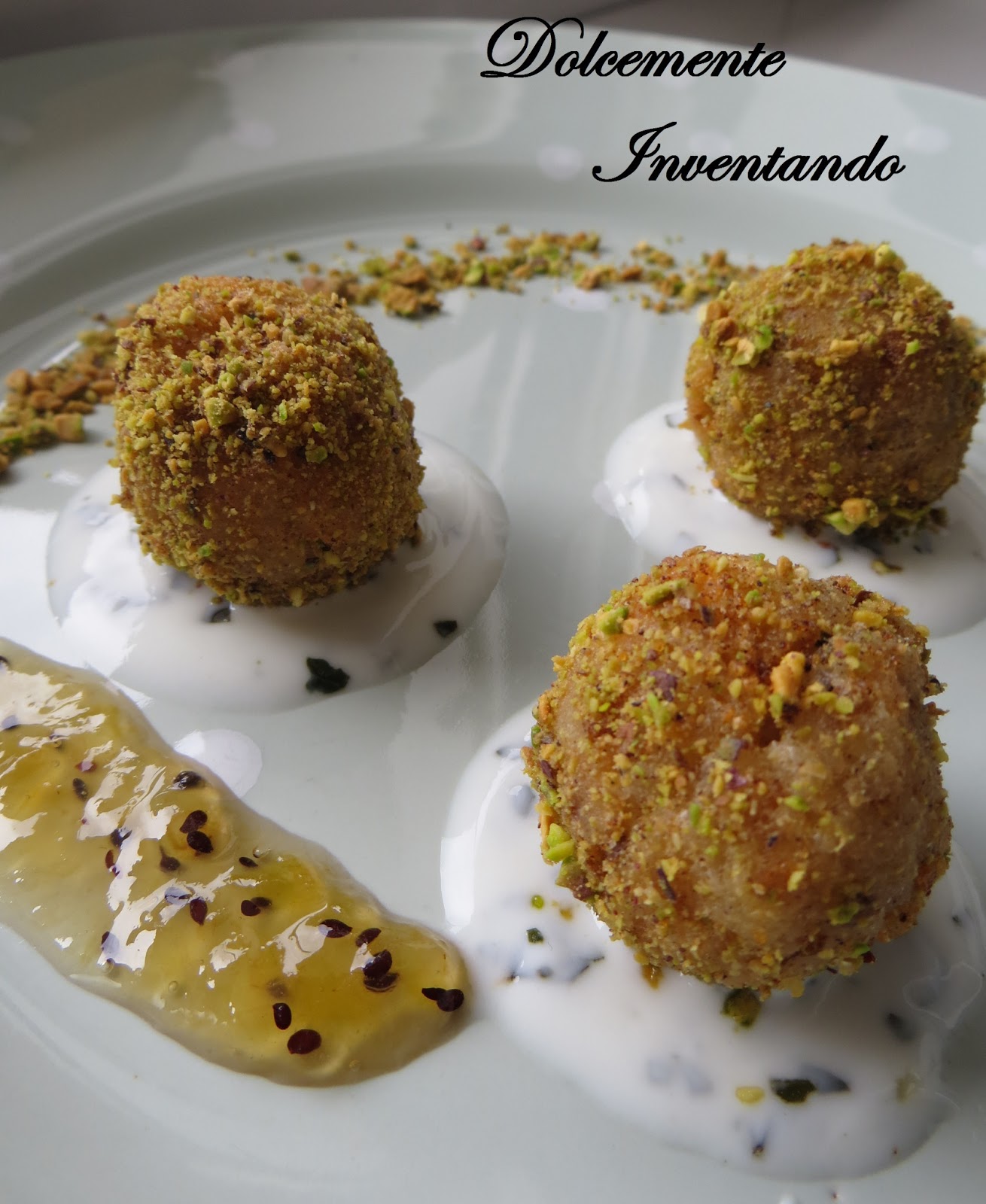 Praline salate al pecorino e pistacchio con yogurt al basilico e confettura di kiwi