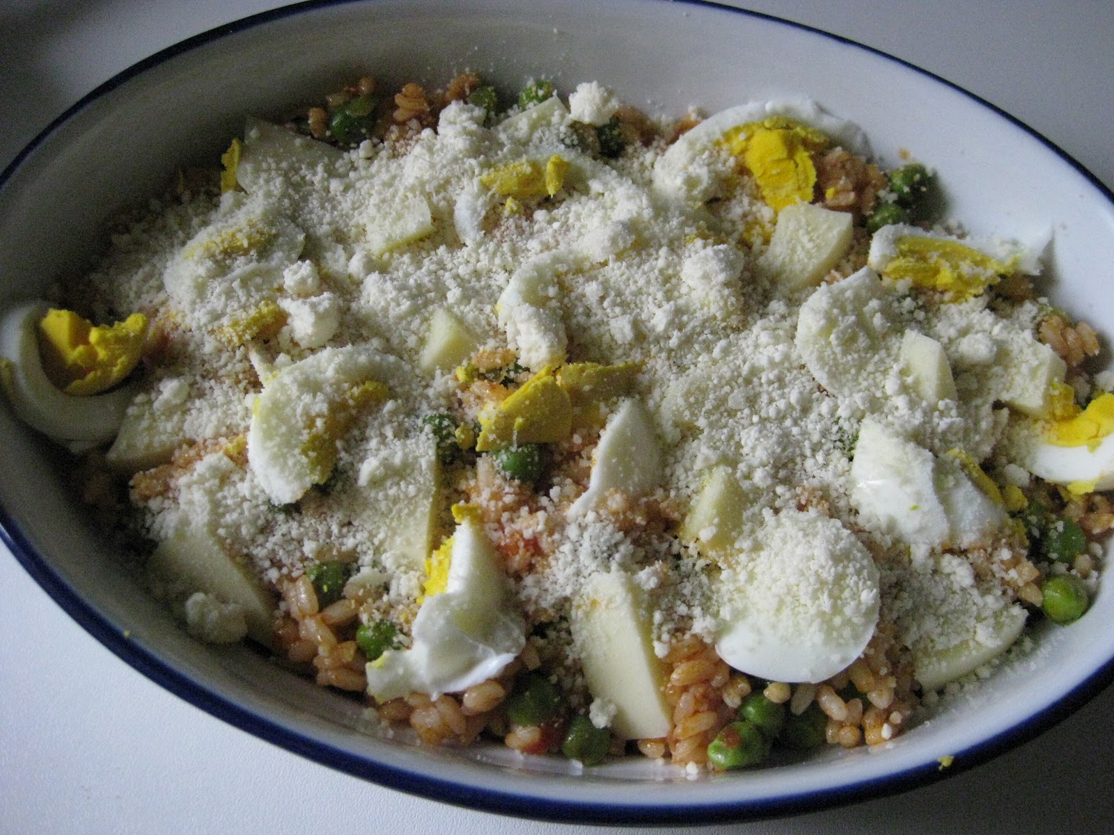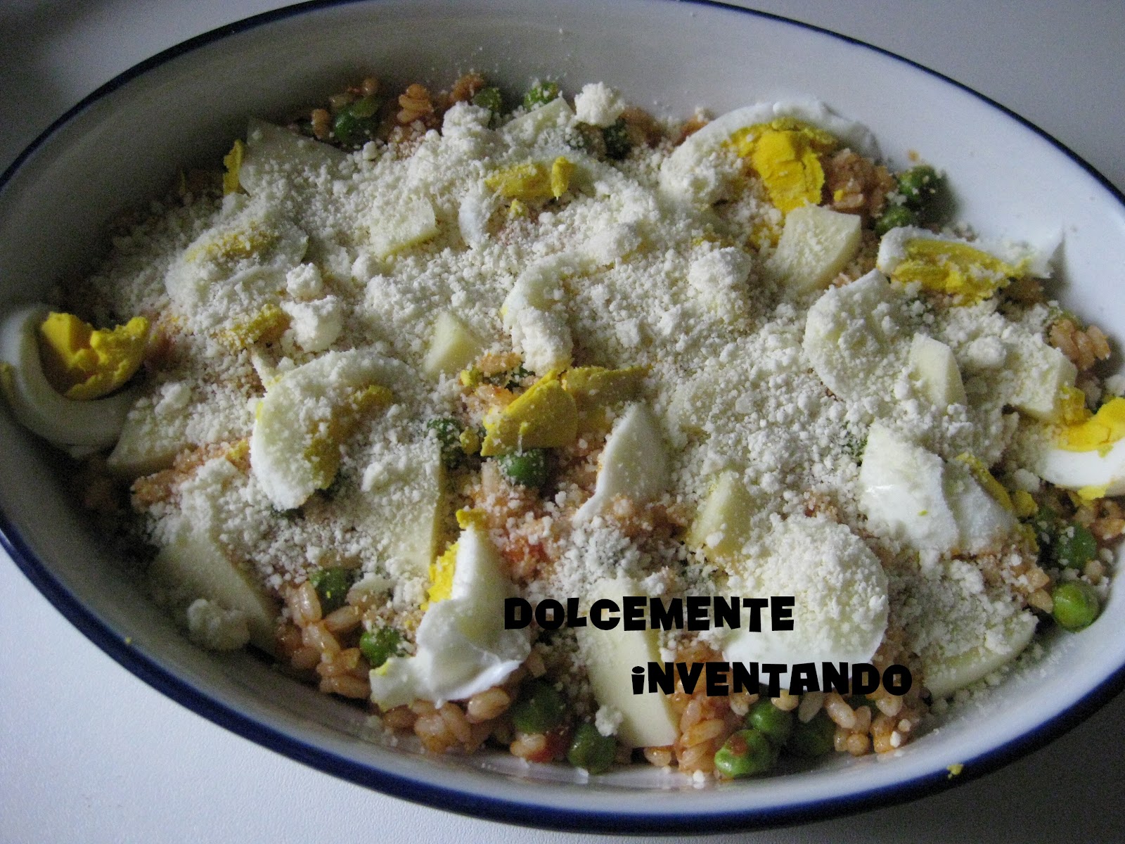 Stendere un primo strato di riso (la metà della quantità totale) sulla pirofila e aggiungervi gradatamente qualche cucchiaio di ragù, il parmigiano grattugiato e l’altro formaggio a tocchetti. Tagliate a fettine le uova sode e coprite con un secondo strato di riso a cui aggiungerete il ragù rimasto e altro parmigiano.