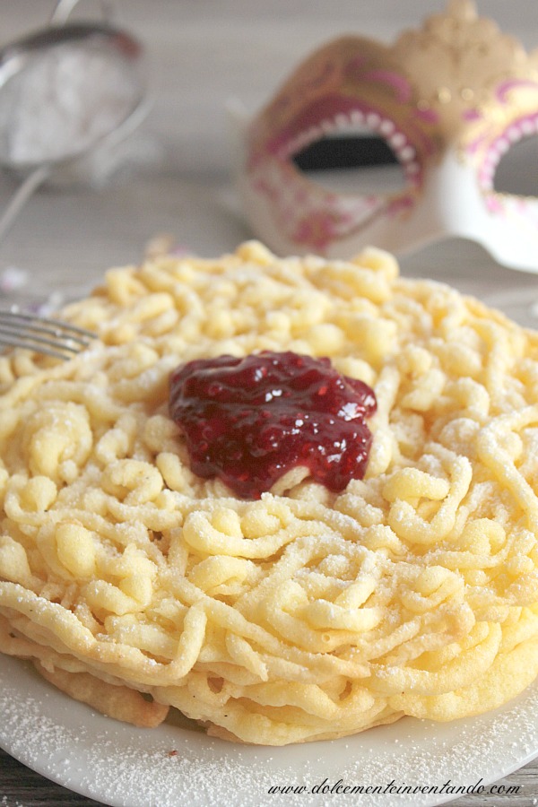 Se vi è mai capitato di venire in estate in Trentino Alto Adige, troverete nelle sagre e nelle feste di paese queste deliziose frittelle accompagnate da confettura di mirtilli rossi o di lamponi, insieme ad una bella spolverata di zucchero a velo… Se volete realizzarli, ricordatevi di usare un imbuto per cuocerli e di avere in casa una buona grappa per fare l’impasto!