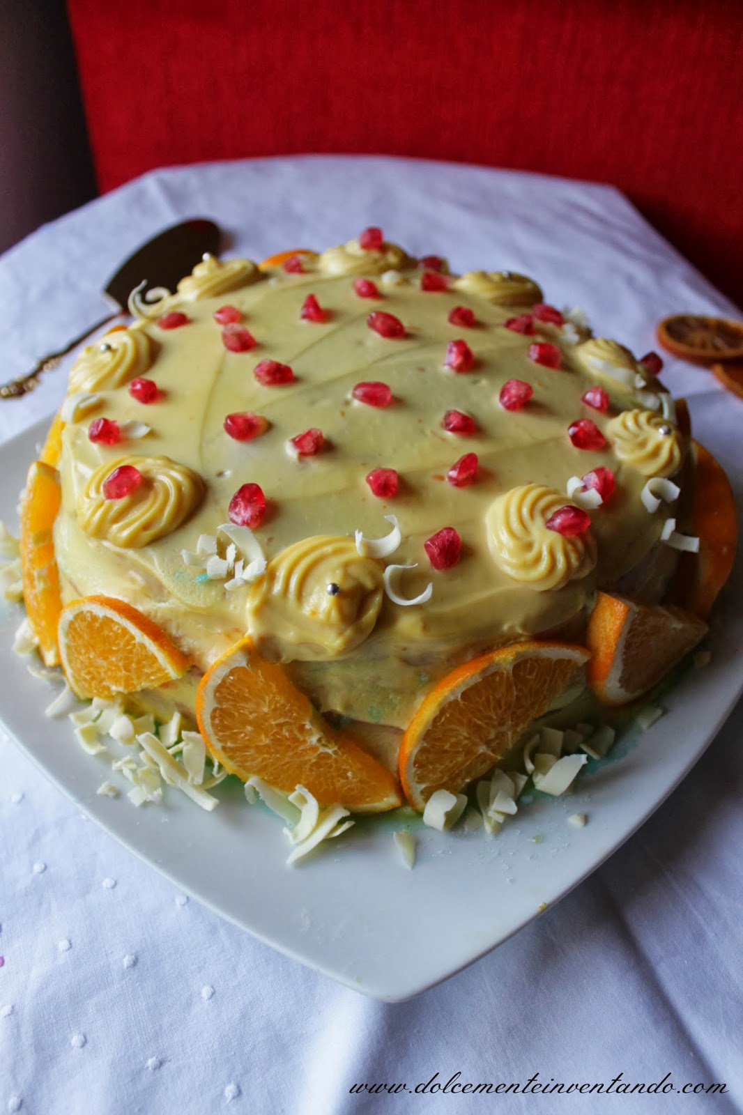 Ricoprite in superficie la torta con il frosting e decorate con melograno, spicchi di arancia e scagliette di cioccolato bianco.