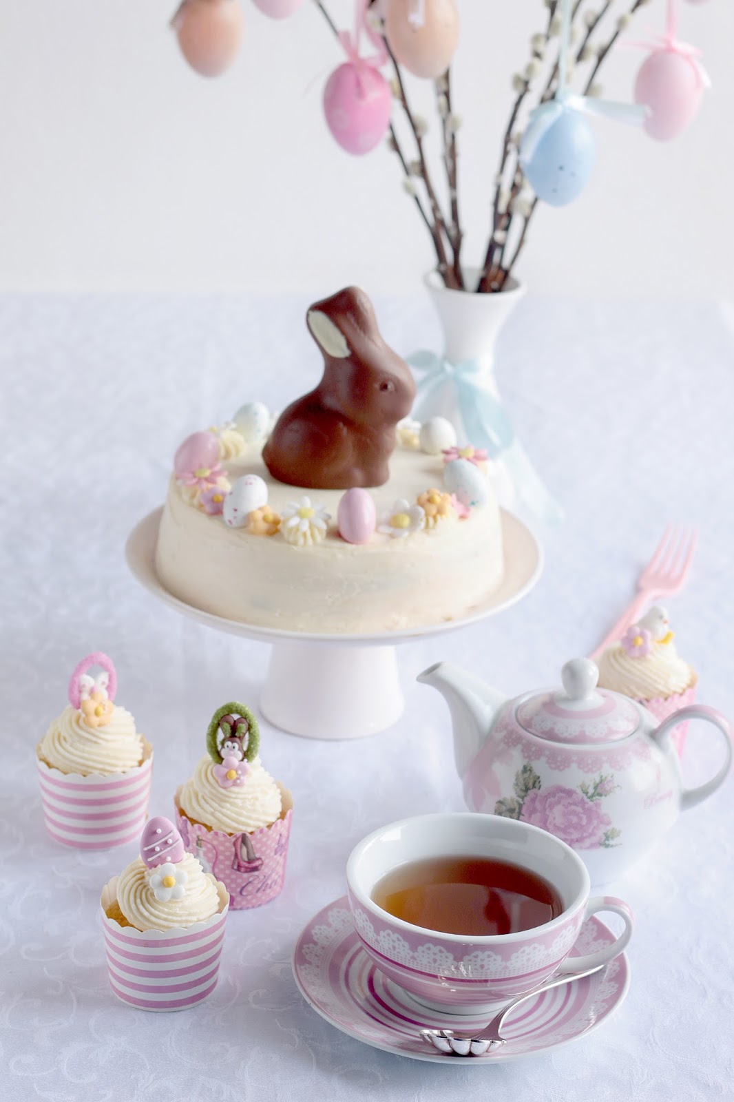 Ho quindi creato torta e cupcakes con coniglietti, zuccherini per un atmosfera colorata, primaverile e pasquale.