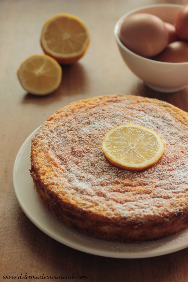 La torta versata con crema pasticcera al limone e confettura di mirtilli è una torta furba, che esce dal forno già farcita senza bisogno di essere tagliata.