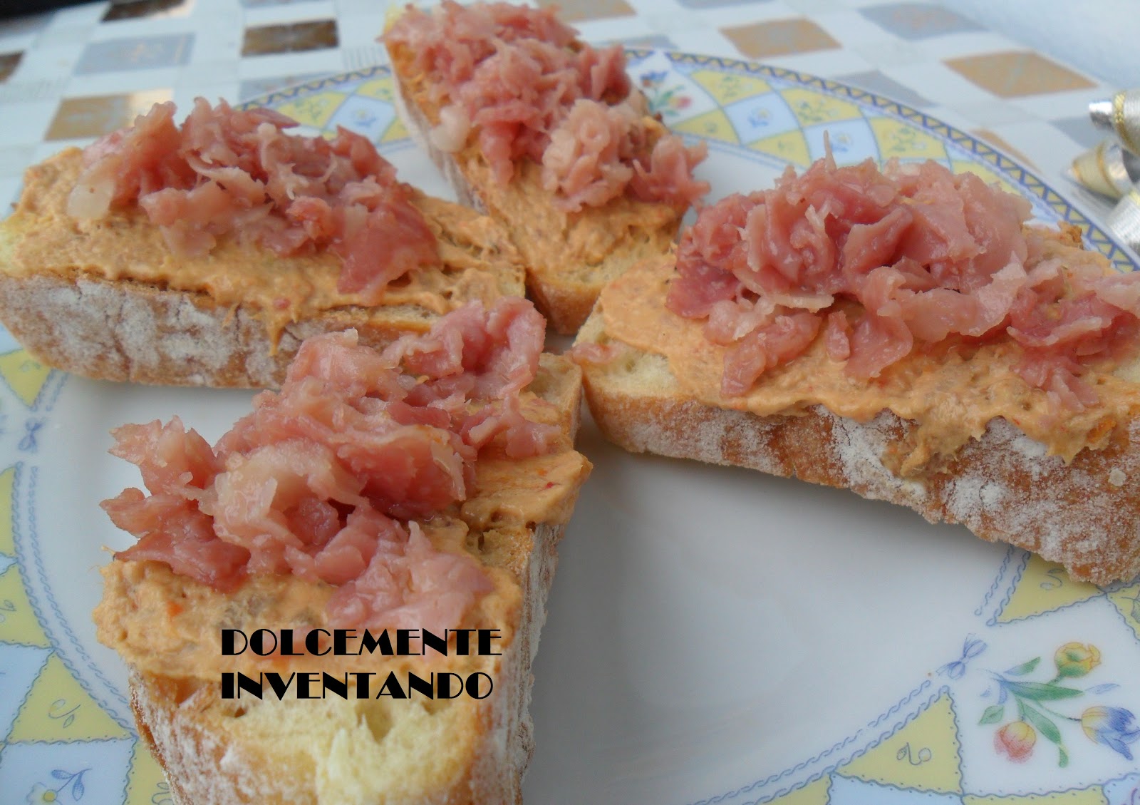 CROSTINI DI PANE CASERECCIO ALLA RILLETTE DI TONNO E POMODORI CON TARTARE DI PROSCIUTTO SALTATO