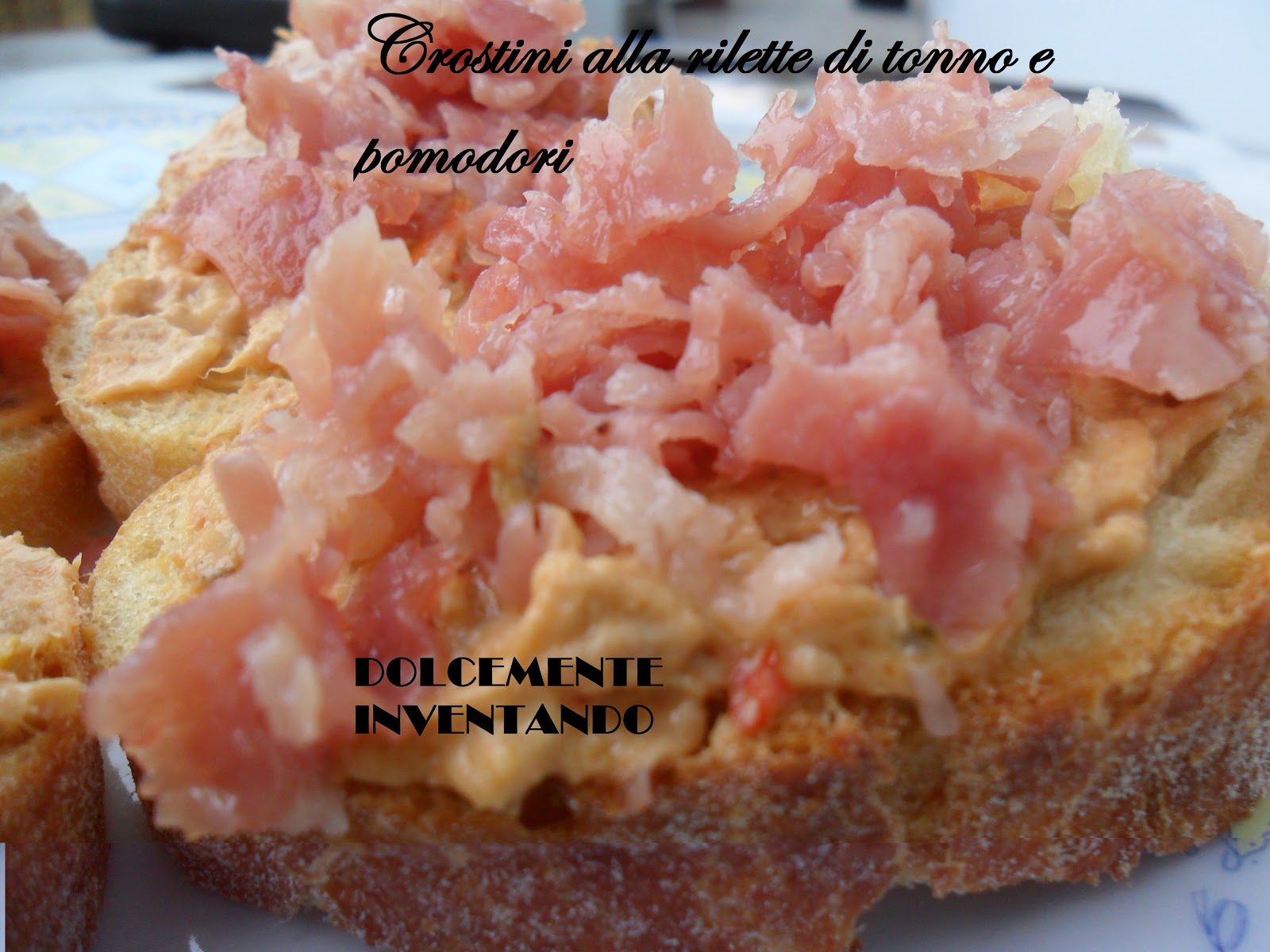 Quella che vi propongo stasera è una ricettina golosa, semplice ma un appetizer finger food molto sfizioso per le feste, si tratta di crostini di pane casereccio con della deliziosa rilette di tonno e pomodori con una “simil tartare” di prosciutto appena saltato in padella: una vera delizia! * Vi chiedo scusa per l’errore ortografico in foto rilette anziché rillette!!!