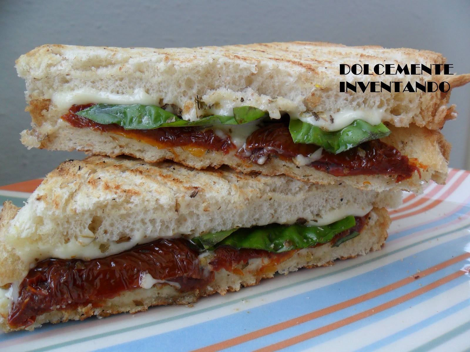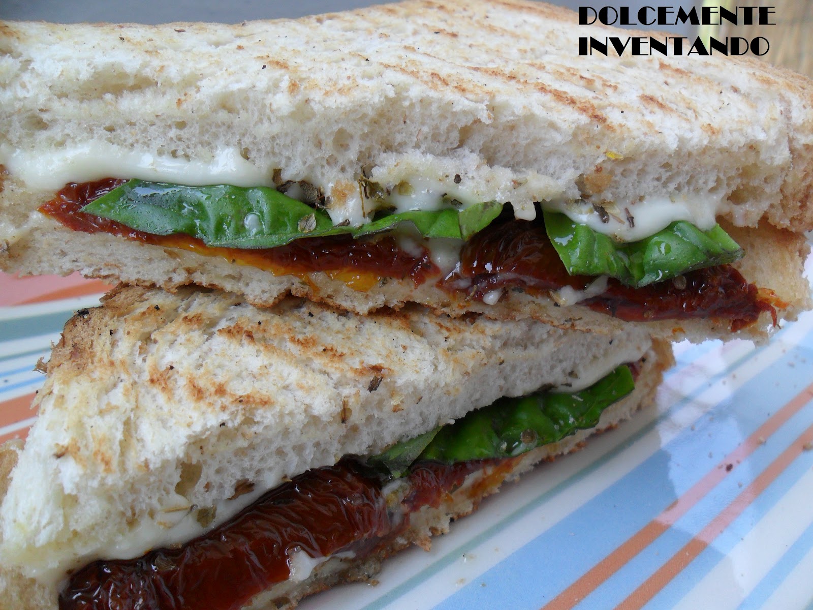 Prendete una fetta di pane e disponete due fette di formaggio, poi mettete i pomodorini secchi sgocciolati dall’olio, spezzettate grossolanamente il basilico, mettete l’origano e poi le due restanti fette di formaggio. Coprite con la seconda fetta di pane. Grigliate il sandwich da entrambe le parti su una piastra riscaldata precedentemente. Per servire, tagliate il vostro panino per diagonale in modo tale da avere 2 triangoli!