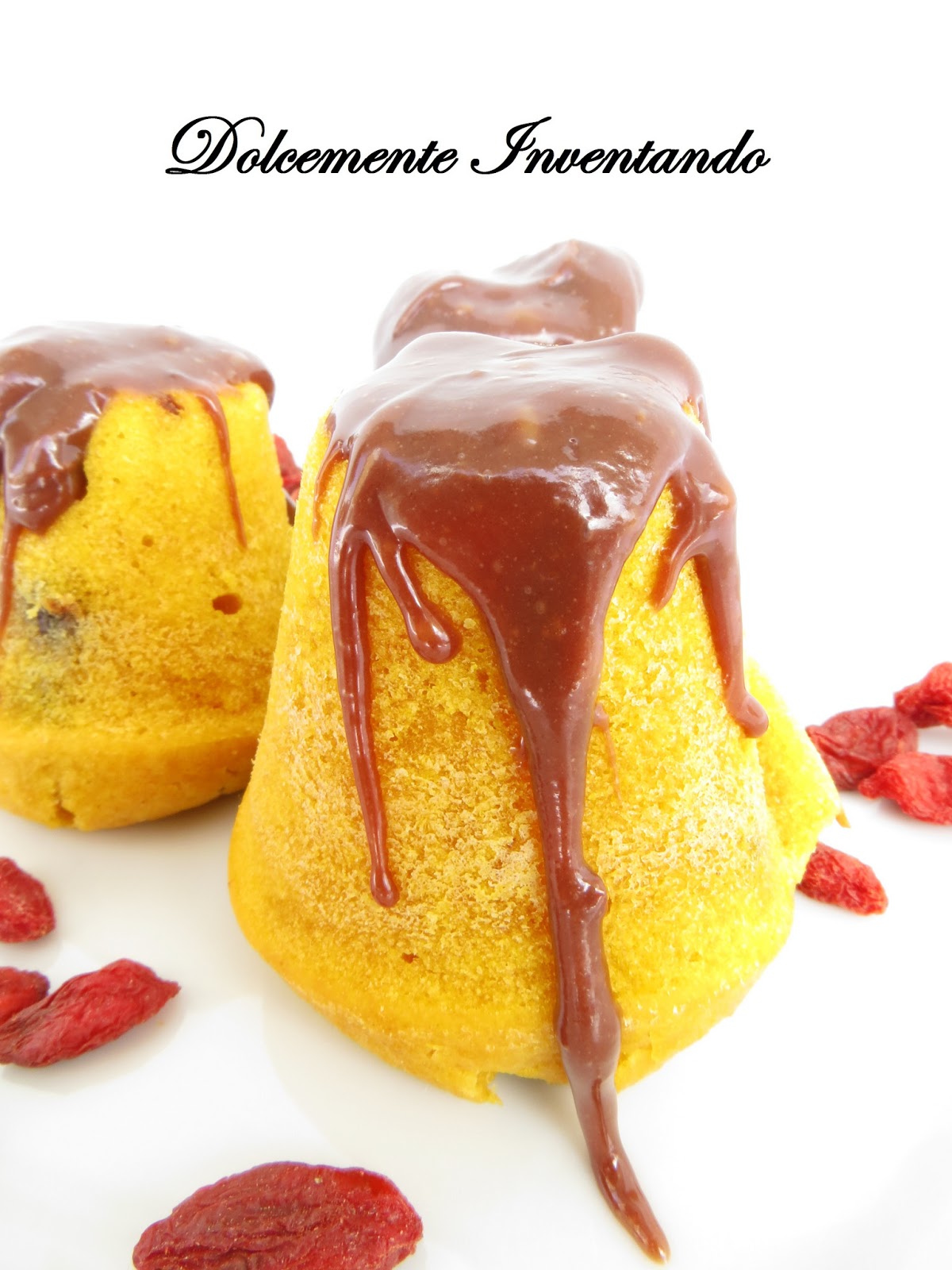VULCANI DI MUFFINS ALLA ZUCCA CON GOCCE DI CIOCCOLATO FONDENTE E BACCHE GOJI CON GANACHE AL CIOCCOLATO AL LATTE