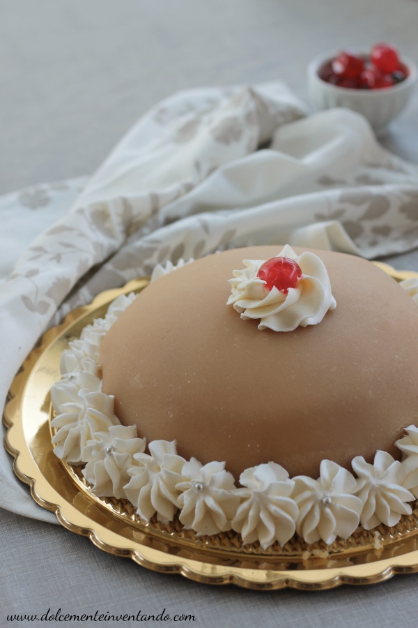 Coprite la torta stendendo il marzapane non troppo sottile, decorate con crema di panna e mascarpone e una ciliegina al centro e perline argentate.
